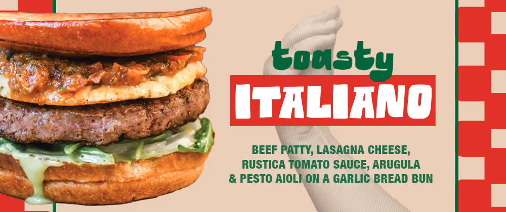 Beef Patty, Lasagna Cheese, Rustica Tomato Sauce, Arugula, Pesto Aioli, Garlic Bread Bun